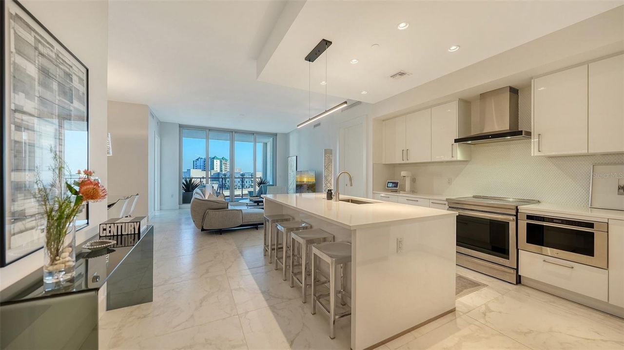 Residence 1013 at The Mark Sarasota offers a rare combination of comfort, convenience, and newer construction in the heart of downtown. Built in 2019, this residence provides modern peace of mind with impact hurricane glass and exterior doors, along with soaring 10-foot ceilings and a bright, open feel throughout. The home includes two deeded side-by-side covered parking spaces located just 20 feet from the elevator, an exceptional convenience rarely found downtown. Positioned on the quiet and highly desirable side of the building, the residence enjoys southern exposure and beautiful views overlooking the pool, with sightlines extending toward Sarasota Bay and the Gulf of Mexico. Set on the 10th floor, this thoughtfully designed layout features two bedrooms plus a den and two-and-a-half baths across 1,577 square feet, along with a covered terrace that extends the living space outdoors. The split-bedroom floor plan provides privacy while maintaining an open, functional flow ideal for both everyday living and entertaining. Walls of glass fill the home with natural light and frame tranquil views over the treetops toward Paul Thorpe Park and the Mermaid Fountain. The kitchen blends style and function with imported cabinetry, stone countertops, designer backsplash, stainless steel appliances, and an upgraded induction cooktop. It connects seamlessly to the main living and dining areas, creating an inviting space to gather. A full-size utility room with additional storage adds everyday practicality. The primary suite opens directly to the terrace and features a spacious walk-in closet and a well-appointed bath with illuminated mirrors and refined finishes. The guest bedroom is privately situated, while the den offers flexibility as a home office or additional lounge space. A climate-controlled storage unit located just down the hall provides added convenience. Residents enjoy The Mark's resort-style amenities, including a heated saltwater pool and spa, outdoor seating and grilling areas, club room with catering kitchen, billiards, fitness center, yoga studio, and spin room. The building also offers a pet-friendly environment, 24/7 front desk staffing, secure lobby access, and overnight roving security. Located in the center of downtown Sarasota, the residence places you just steps from the renowned Sarasota Farmers Market and only two blocks from Whole Foods Market. Cultural attractions including the Sarasota Opera House, Florida Studio Theatre, and Selby Public Library are all within easy reach, along with dining, galleries, and the waterfront. Surrounded by exciting new luxury developments, including the nearby Waldorf Astoria Residences Sarasota, this location continues to elevate as one of downtown's most sought-after areas. Don't miss the opportunity to own a newer-built residence in one of Sarasota's most vibrant and walkable neighborhoods.